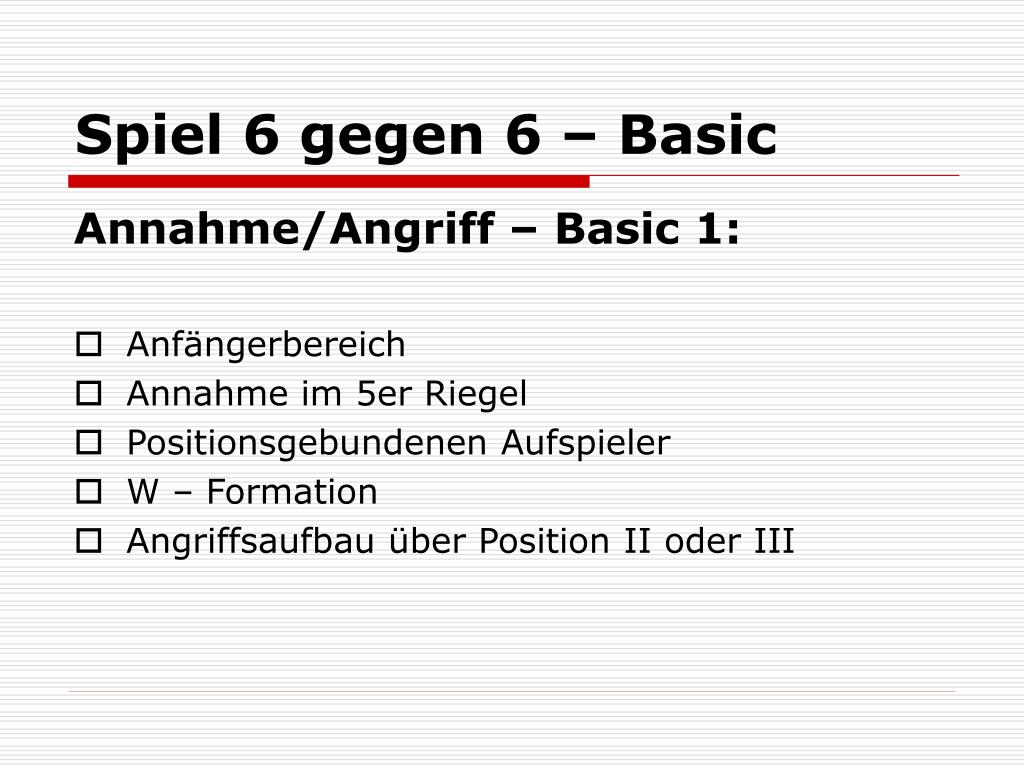Spiel 6 gegen 6 – Basic Annahme/Angriff – Basic 1: • Anfängerbereich • Annahme im 5er Riegel • Positionsgebundenen Aufspieler • W – Formation • Angriffsaufbau über Position II oder III