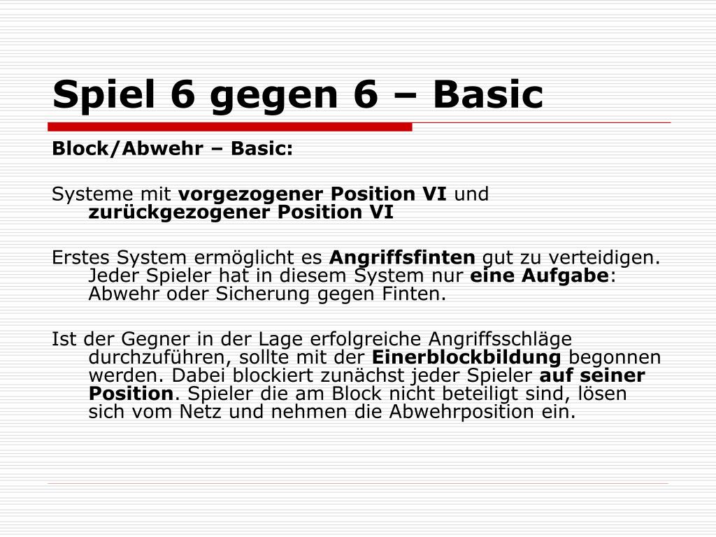 Spiel 6 gegen 6 – Basic Block/Abwehr – Basic: Systeme mit vorgezogener Position VI und zurückgezogener Position VI Erstes System ermöglicht es Angriffsfinten gut zu verteidigen. Jeder Spieler hat in diesem System nur eine Aufgabe: Abwehr oder Sicherung gegen Finten. Ist der Gegner in der Lage erfolgreiche Angriffsschläge durchzuführen, sollte mit der Einerblockbildung begonnen werden. Dabei blockiert zunächst jeder Spieler auf seiner Position. Spieler die am Block nicht beteiligt sind, lösen sich vom Netz und nehmen die Abwehrposition ein.