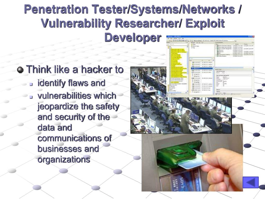 Penetration Tester/Systems/Networks / Vulnerability Researcher/ Exploit Developer • Think like a hacker to • identify flaws and • vulnerabilities which jeopardize the safety and security of the data and communications of businesses and organizations