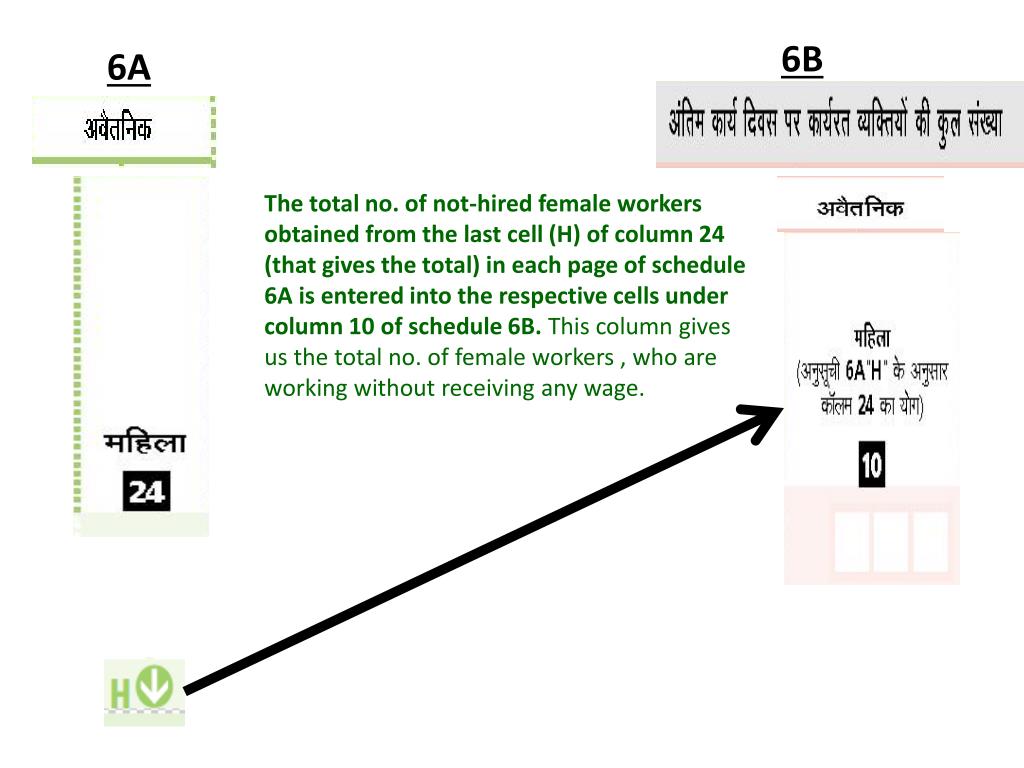 6B 6A The total no. of not-hired female workers obtained from the last cell (H) of column 24 (that gives the total) in each page of schedule 6A is entered into the respective cells under column 10 of schedule 6B. This column gives us the total no. of female workers , who are working without receiving any wage.
