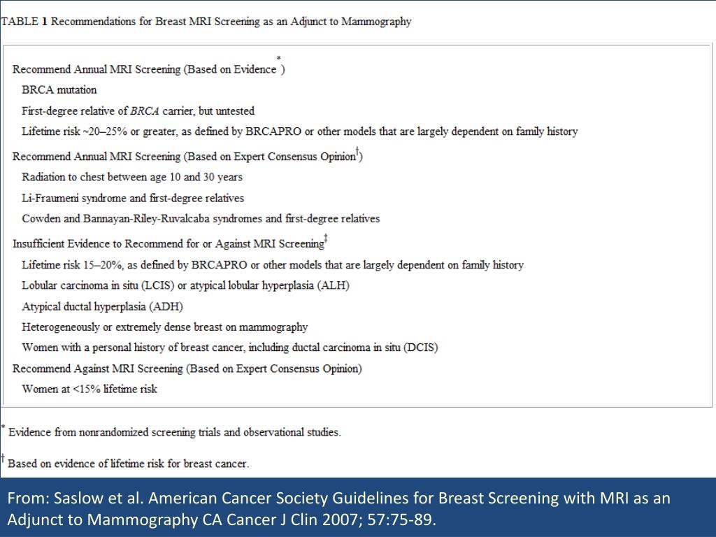 From: Saslow et al.American Cancer Society Guidelines for Breast Screening with MRI as an Adjunct to Mammography CA Cancer J Clin 2007; 57:75-89.
