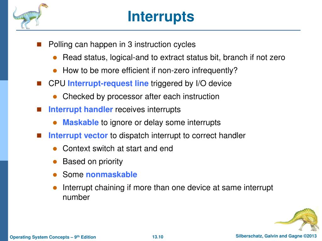 Interrupts • Polling can happen in 3 instruction cycles • Read status, logical-and to extract status bit, branch if not zero • How to be more efficient if non-zero infrequently? • CPU Interrupt-request line triggered by I/O device • Checked by processor after each instruction • Interrupt handlerreceives interrupts • Maskable to ignore or delay some interrupts • Interrupt vector to dispatch interrupt to correct handler • Context switch at start and end • Based on priority • Some nonmaskable • Interrupt chaining if more than one device at same interrupt number