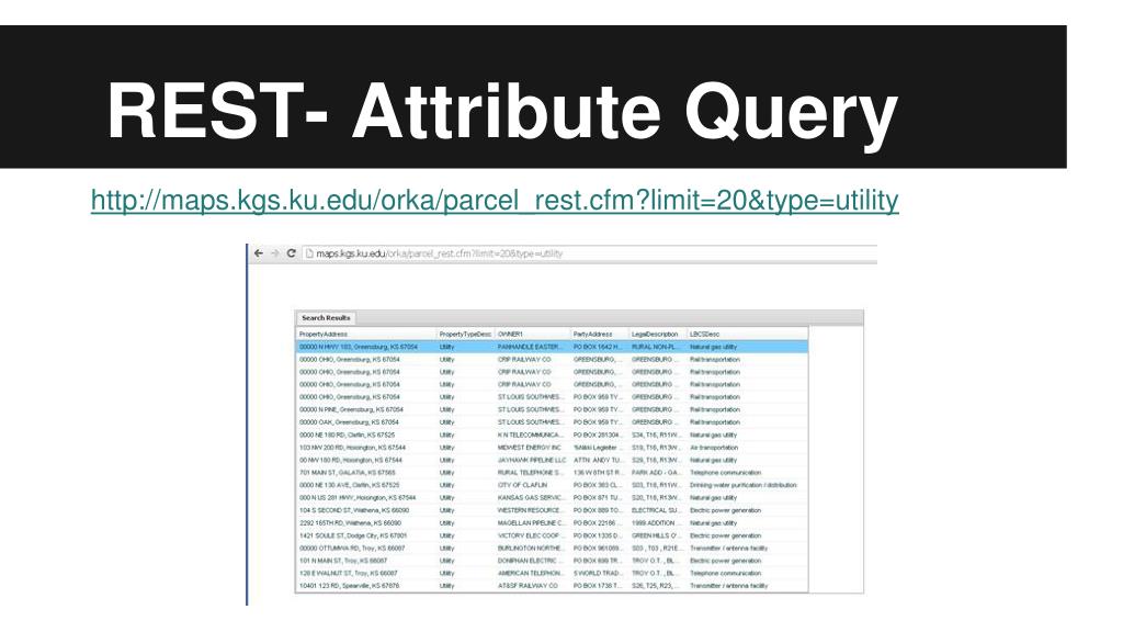 REST- Attribute Query http://maps.kgs.ku.edu/orka/parcel_rest.cfm?limit=20&type=utility