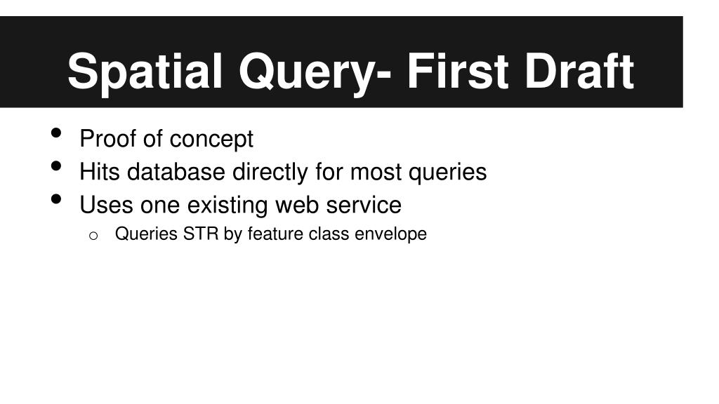 Spatial Query- First Draft • Proof of concept • Hits database directly for most queries • Uses one existing web service • Queries STR by feature class envelope
