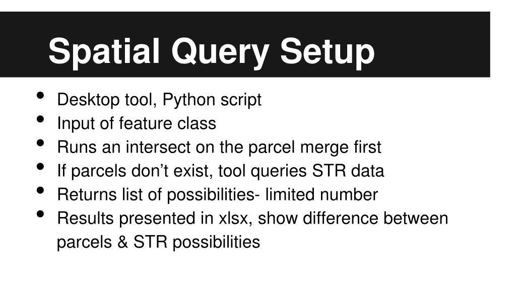 Spatial Query Setup • Desktop tool, Python script • Input of feature class • Runs an intersect on the parcel merge first • If parcels don’t exist, tool queries STR data • Returns list of possibilities- limited number • Results presented in xlsx, show difference between parcels & STR possibilities