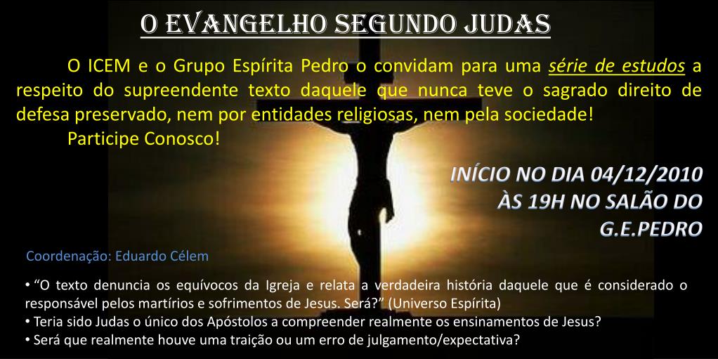 O Evangelho Segundo Judas. O ICEM e o Grupo Espírita Pedro o convidam para uma série de estudos a respeito do supreendente texto daquele que nunca teve o sagrado direito de defesa preservado , nem por entidades religiosas , nem pela sociedade ! Participe Conosco !.