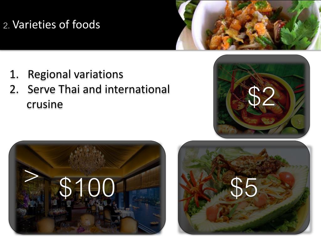 2. Varieties of foods $2 Regionalvariations Serve Thai and international crusine $100 $5 >