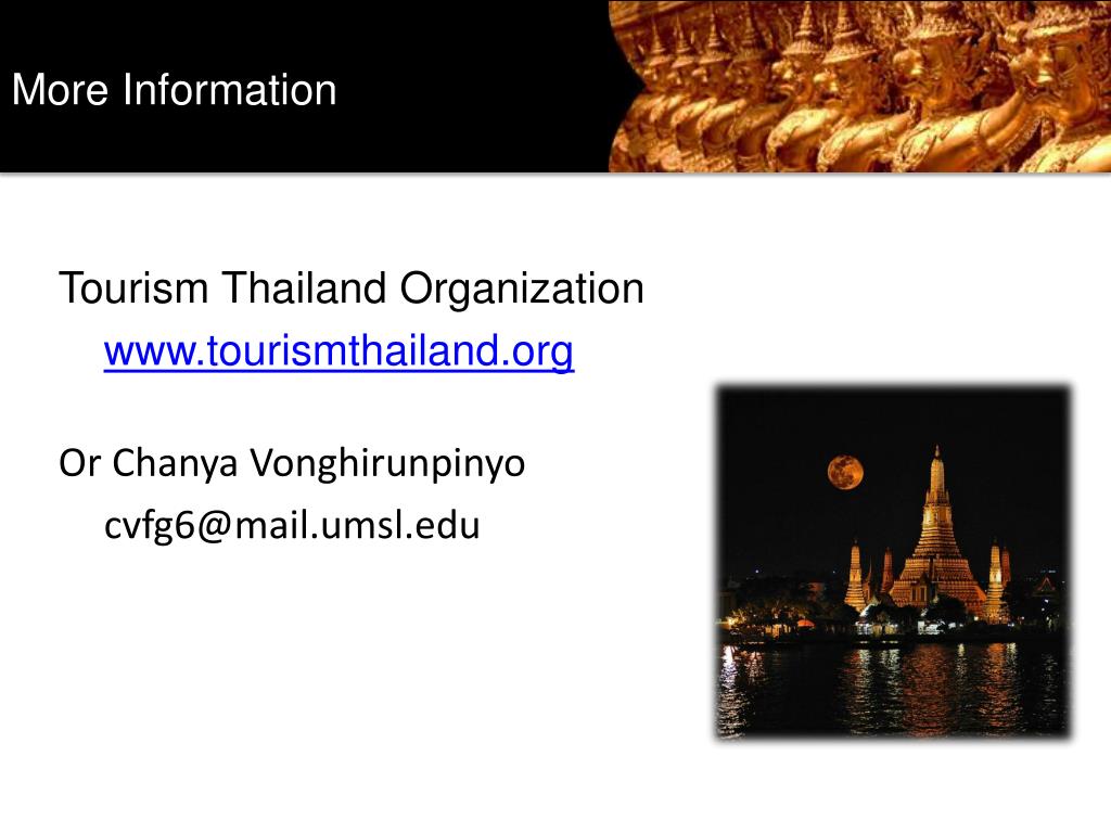 More Information • Tourism Thailand Organization • www.tourismthailand.org • Or Chanya Vonghirunpinyo • cvfg6@mail.umsl.edu