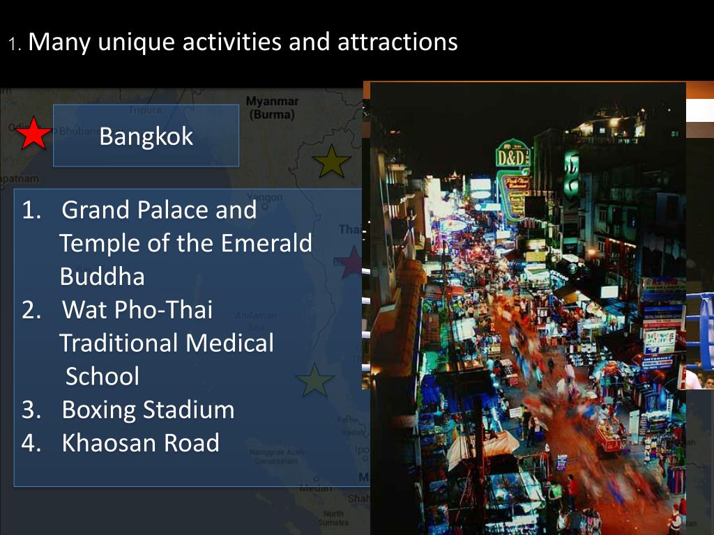1. Many unique activities and attractions Bangkok Grand Palace and Temple of the Emerald Buddha Wat Pho-Thai Traditional Medical School 3. Boxing Stadium 4. Khaosan Road