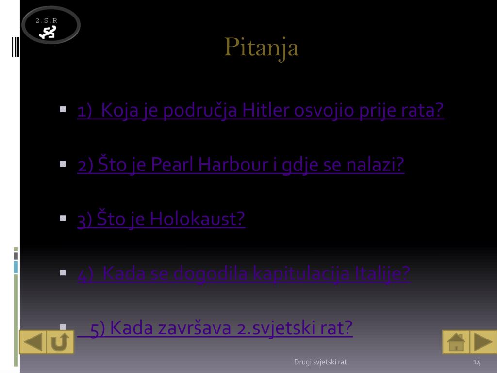 Pitanja • 1) Koja je područja Hitler osvojio prije rata? • 2) Što je Pearl Harbour i gdje se nalazi? • 3) Što je Holokaust? • 4) Kada se dogodila kapitulacija Italije? • 5) Kada završava 2.svjetski rat? Drugi svjetski rat