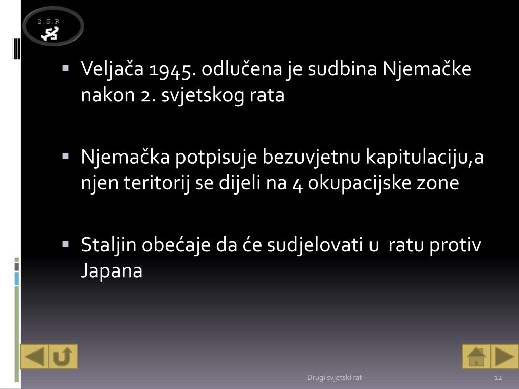 Veljača 1945. odlučena je sudbina Njemačke nakon 2. svjetskog rata • Njemačka potpisuje bezuvjetnu kapitulaciju,a njen teritorij se dijeli na 4 okupacijske zone • Staljin obećaje da će sudjelovati u ratu protiv Japana Drugi svjetski rat