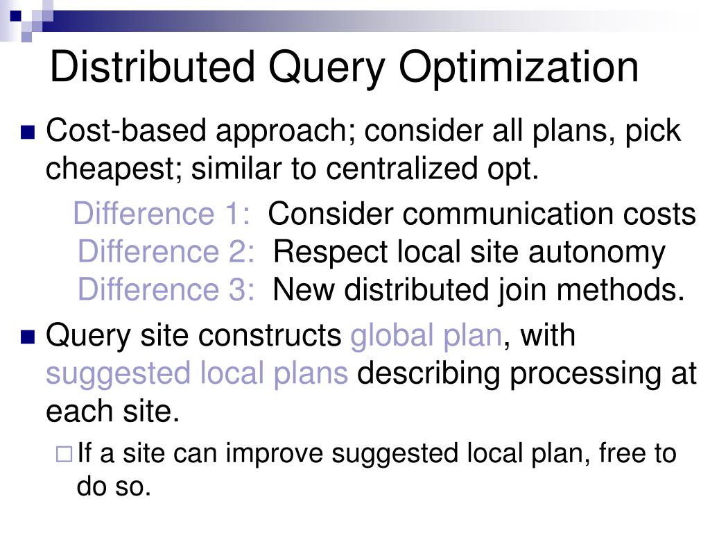 Distributed Query Optimization • Cost-based approach; consider all plans, pick cheapest; similar to centralized opt. Difference 1: Consider communication costs Difference 2: Respect local site autonomy Difference 3: New distributed join methods. • Query site constructs global plan, with suggested local plans describing processing at each site. • If a site can improve suggested local plan, free to do so.