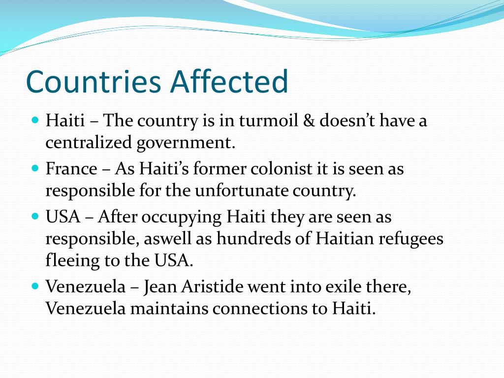 Countries Affected • Haiti – The country is in turmoil & doesn’t have a centralized government. • France – As Haiti’s former colonist it is seen as responsible for the unfortunate country. • USA – After occupying Haiti they are seen as responsible, aswell as hundreds of Haitian refugees fleeing to the USA. • Venezuela – Jean Aristide went into exile there, Venezuela maintains connections to Haiti.
