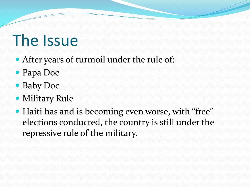 The Issue • After years of turmoil under the rule of: • Papa Doc • Baby Doc • Military Rule • Haiti has and is becoming even worse, with “free” elections conducted, the country is still under the repressive rule of the military.