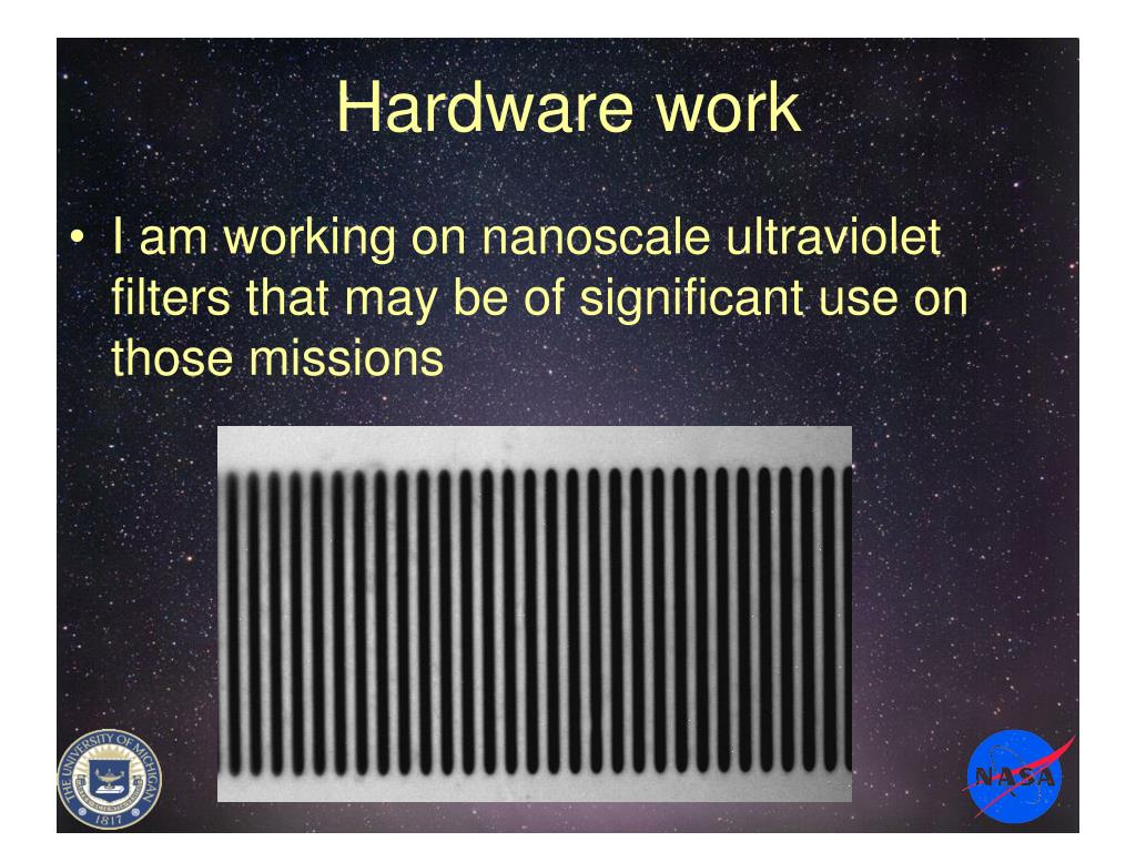 Hardware work • I am working on nanoscale ultraviolet filters that may be of significant use on those missions