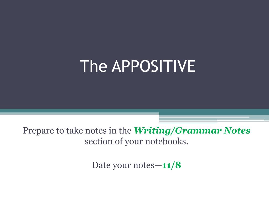 The APPOSITIVE Prepare to take notes in the Writing/Grammar Notes section of your notebooks. Date your notes—11/8