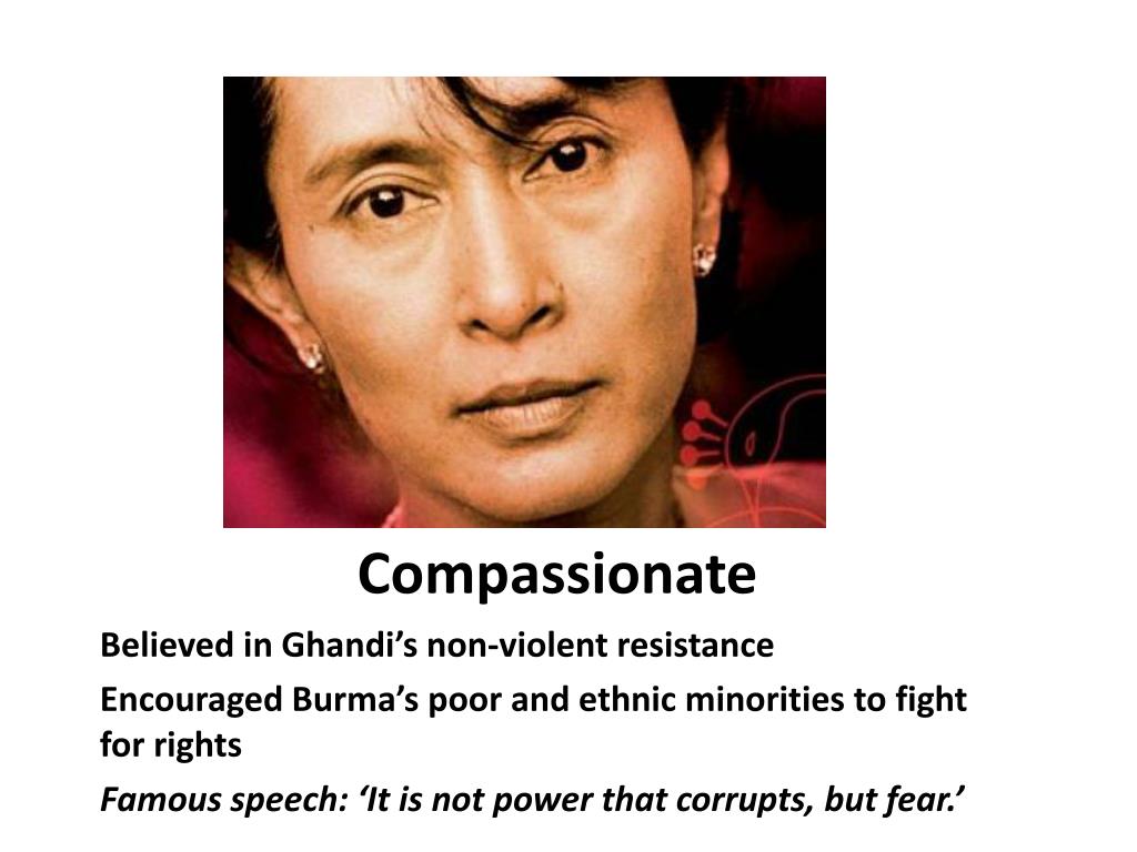 Compassionate Believed in Ghandi’s non-violent resistance Encouraged Burma’s poor and ethnic minorities to fight for rights Famous speech: ‘It is not power that corrupts, but fear.’