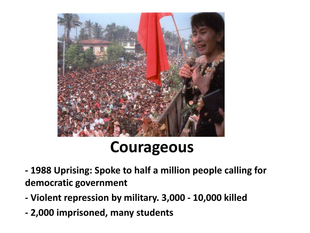 Courageous - 1988 Uprising: Spoke to half a million people calling for democratic government - Violent repression by military. 3,000 - 10,000 killed - 2,000 imprisoned, many students