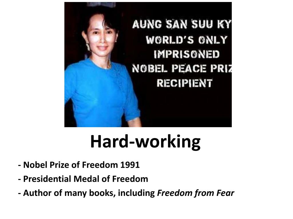 Hard-working - Nobel Prize of Freedom 1991 - Presidential Medal of Freedom - Author of manybooks, including Freedom from Fear