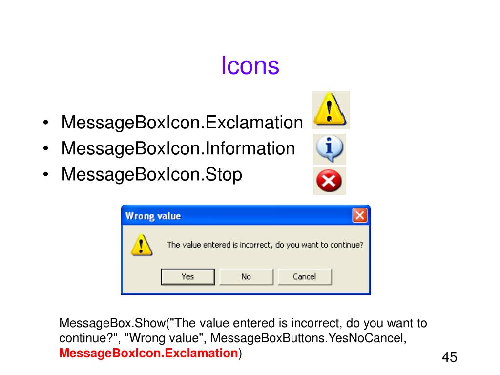 Icons • MessageBoxIcon.Exclamation • MessageBoxIcon.Information • MessageBoxIcon.Stop MessageBox.Show("The value entered is incorrect, do you want to continue?", "Wrong value", MessageBoxButtons.YesNoCancel, MessageBoxIcon.Exclamation)