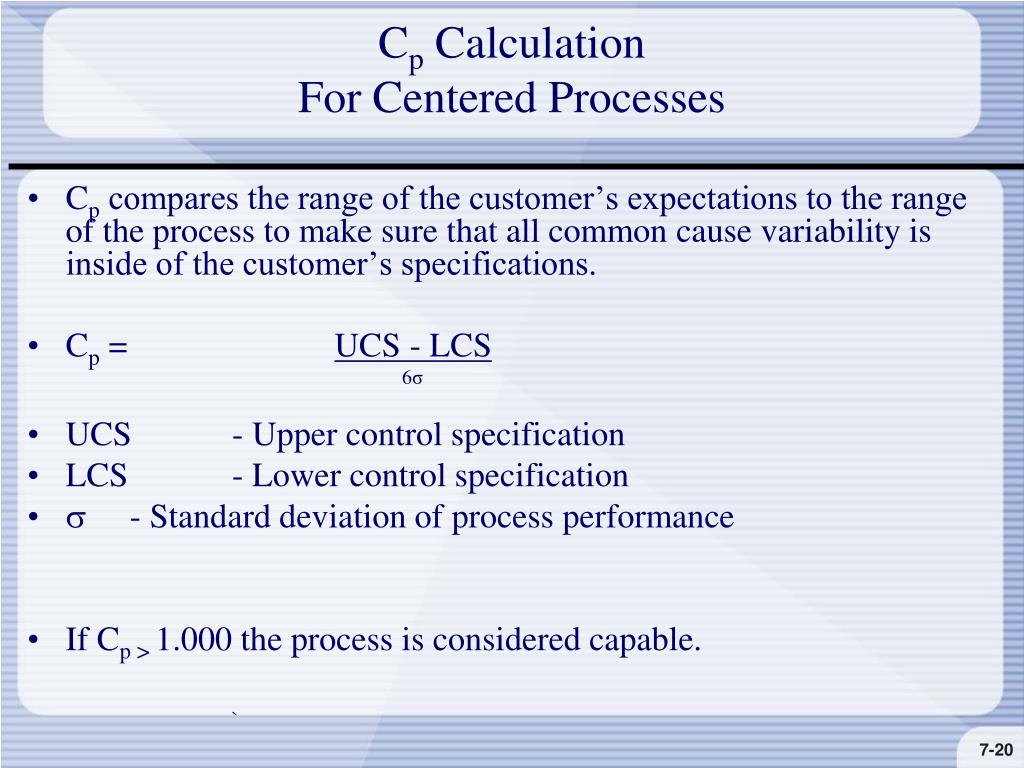 Cp CalculationFor Centered Processes • Cp compares the range of the customer’s expectations to the range of the process to make sure that all common cause variability is inside of the customer’s specifications. • Cp = UCS - LCS 6σ • UCS - Upper control specification • LCS - Lower control specification • - Standard deviation of process performance • If Cp > 1.000 the process is considered capable. `