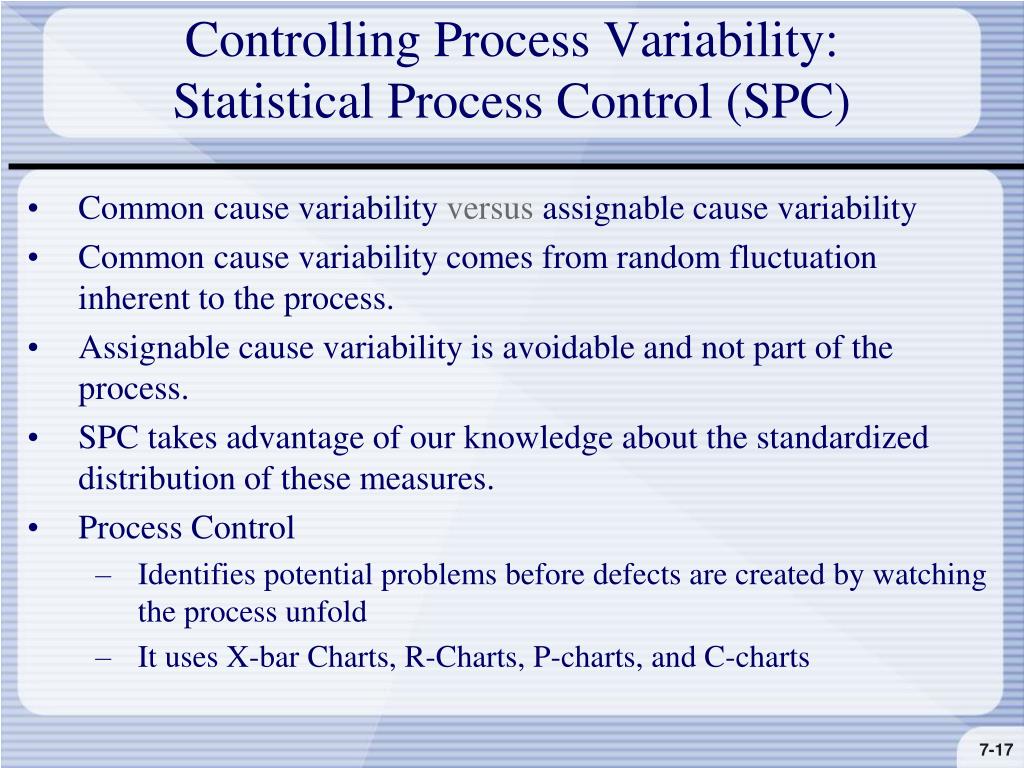 Controlling Process Variability:Statistical Process Control (SPC) • Common cause variability versus assignable cause variability • Common cause variability comes from random fluctuation inherent to the process. • Assignable cause variability is avoidable and not part of the process. • SPC takes advantage of our knowledge about the standardized distribution of these measures. • Process Control • Identifies potential problems before defects are created by watching the process unfold • It uses X-bar Charts, R-Charts, P-charts, and C-charts