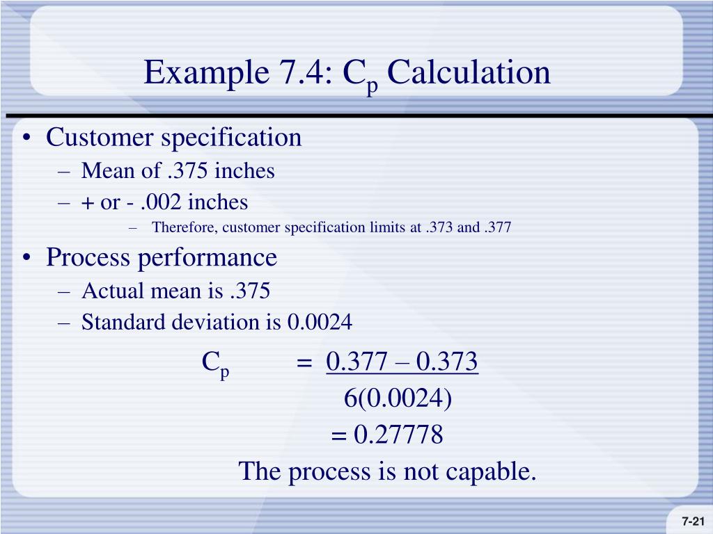 Example 7.4: Cp Calculation • Customer specification • Mean of .375 inches • + or - .002 inches • Therefore, customer specification limits at .373 and .377 • Process performance • Actual mean is .375 • Standard deviation is 0.0024 Cp = 0.377 – 0.373 6(0.0024) = 0.27778 The process is not capable.