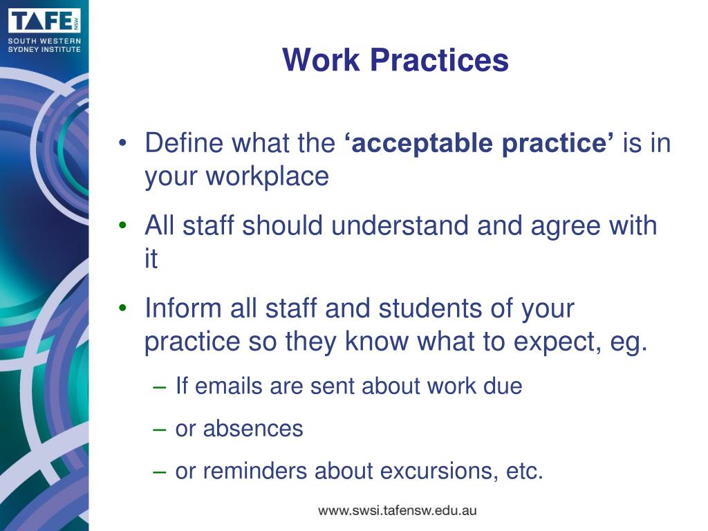 Work PracticesWork Practices • Define what the ‘acceptable practice’ is in your workplace • All staff should understand and agree with it • Inform all staff and students of your practice so they know what to expect, eg. • If emails are sent about work due • or absences • or reminders about excursions, etc.