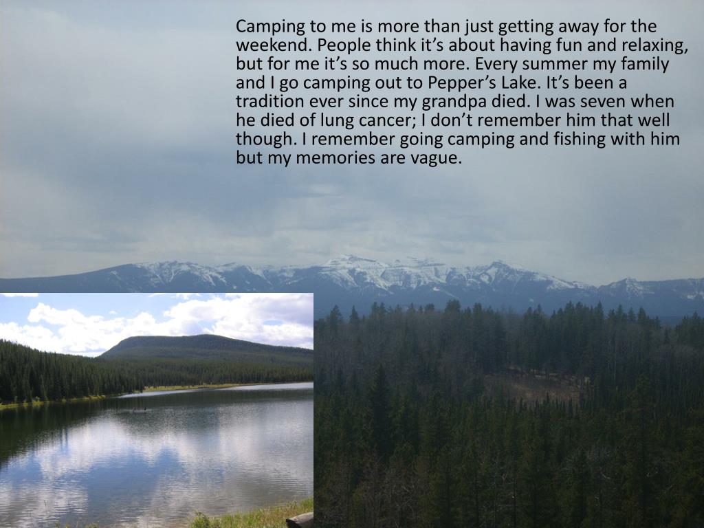 2. Camping to me is more than just getting away for the weekend. People think it’s about having fun and relaxing, but for me it’s so much more. Every summer my family and I go camping out to Pepper’s Lake. It’s been a tradition ever since my grandpa died. I was seven when he died of lung cancer; I don’t remember him that well though. I remember going camping and fishing with him but my memories are vague.