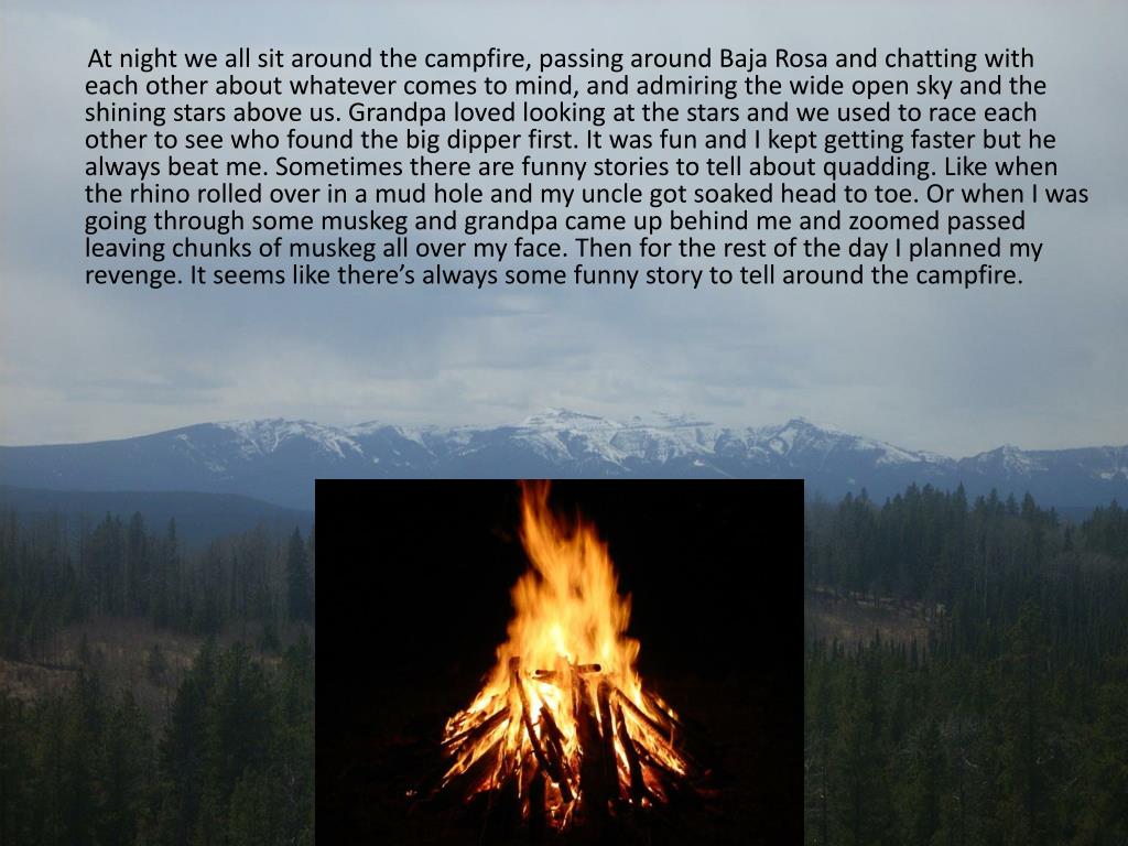8. At night we all sit around the campfire, passing around Baja Rosa and chatting with each other about whatever comes to mind, and admiring the wide open sky and the shining stars above us. Grandpa loved looking at the stars and we used to race each other to see who found the big dipper first. It was fun and I kept getting faster but he always beat me. Sometimes there are funny stories to tell about quadding. Like when the rhino rolled over in a mud hole and my uncle got soaked head to toe. Or when I was going through some muskeg and grandpa came up behind me and zoomed passed leaving chunks of muskeg all over my face. Then for the rest of the day I planned my revenge. It seems like there’s always some funny story to tell around the campfire.