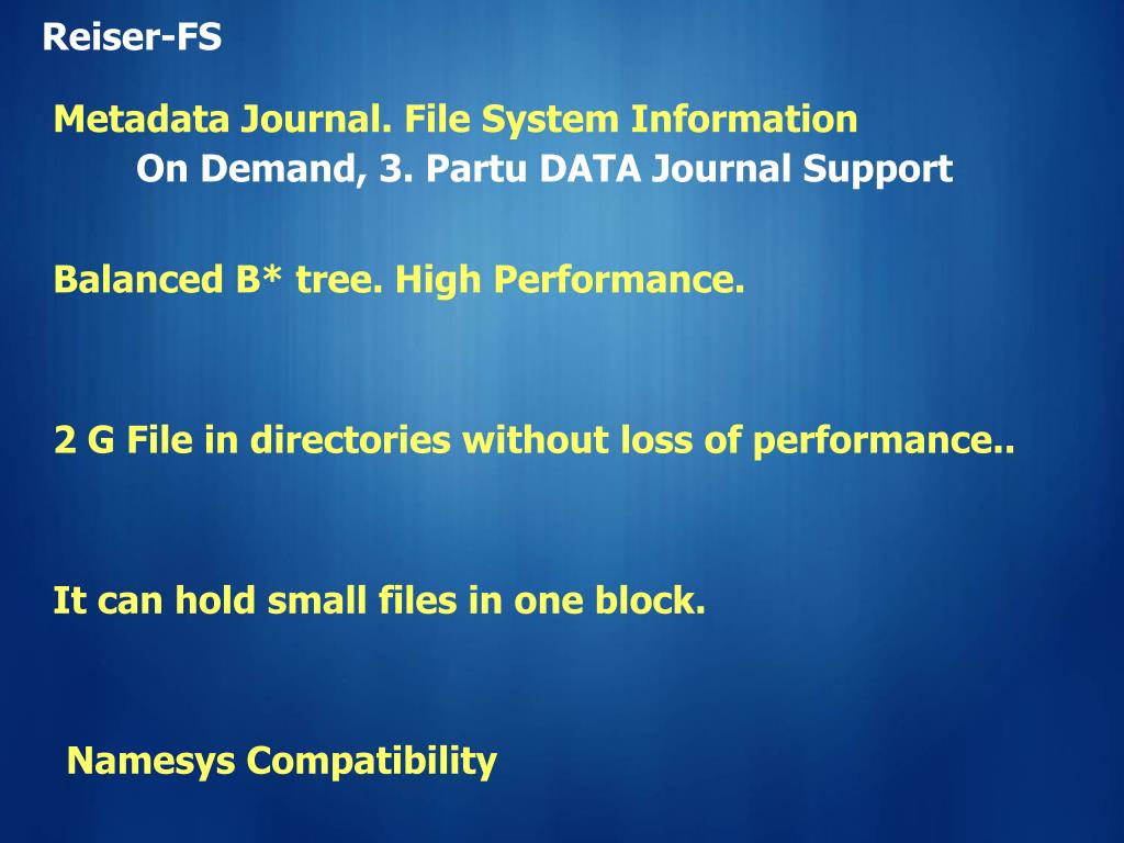 Reiser-FS Metadata Journal. File System Information On Demand, 3. Partu DATA Journal Support Balanced B* tree. High Performance. 2 G File in directories without loss of performance.. It can hold small files in one block. Namesys Compatibility