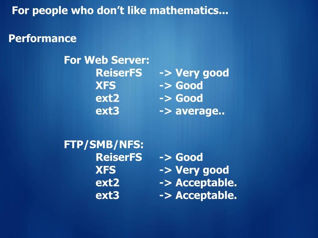 For people who don’t like mathematics... Performance For Web Server: ReiserFS -> Very good XFS -> Good ext2 -> Good ext3 -> average.. FTP/SMB/NFS: ReiserFS -> Good XFS -> Very good ext2 -> Acceptable. ext3 -> Acceptable.