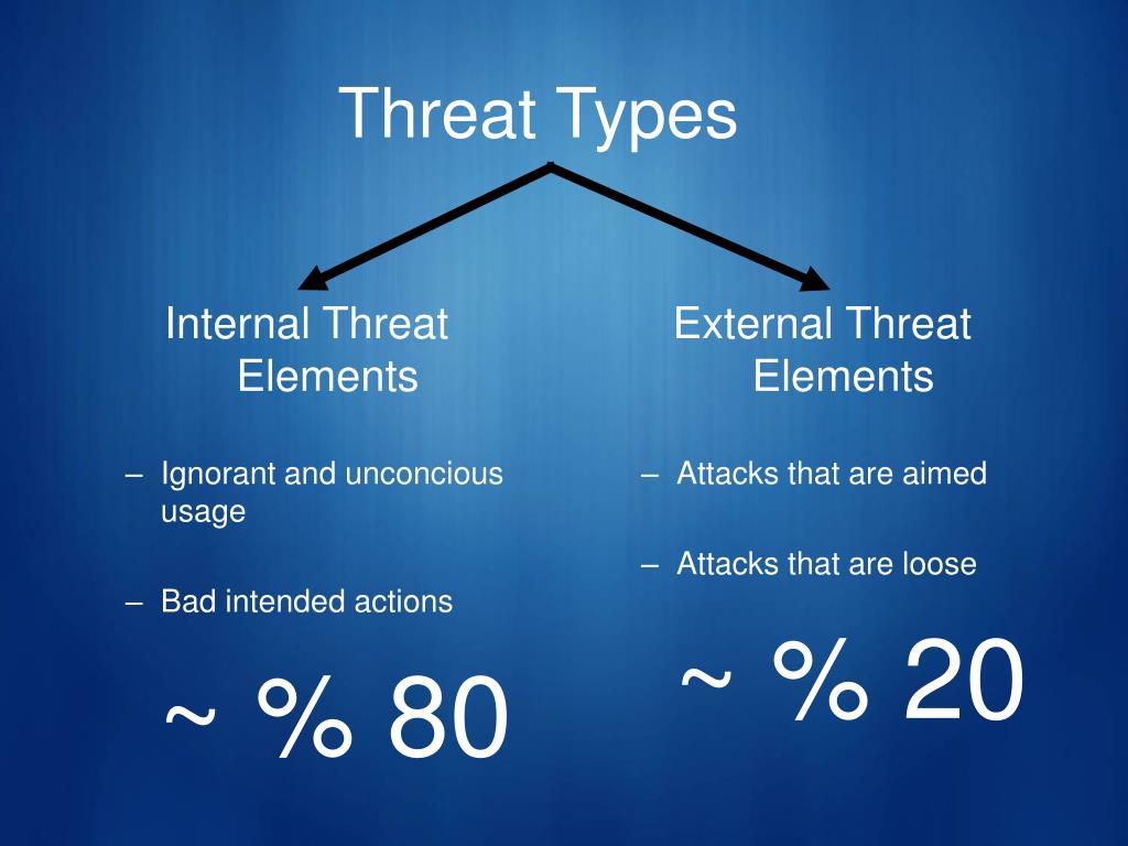 Internal Threat Elements Ignorant and unconcious usage Bad intended actions ~ % 80 External Threat Elements Attacks that are aimed Attacks that are loose ~ % 20 Threat Types