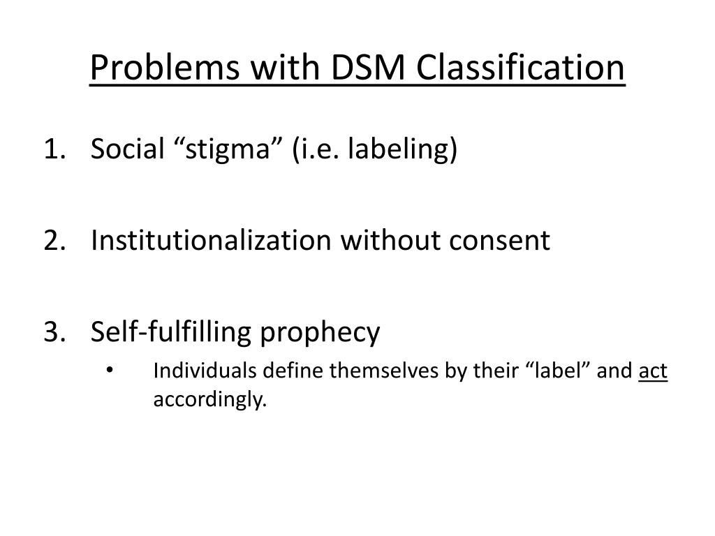 Problems with DSM Classification • Social “stigma” (i.e. labeling) • Institutionalization without consent • Self-fulfilling prophecy • Individuals define themselves by their “label” and act accordingly.