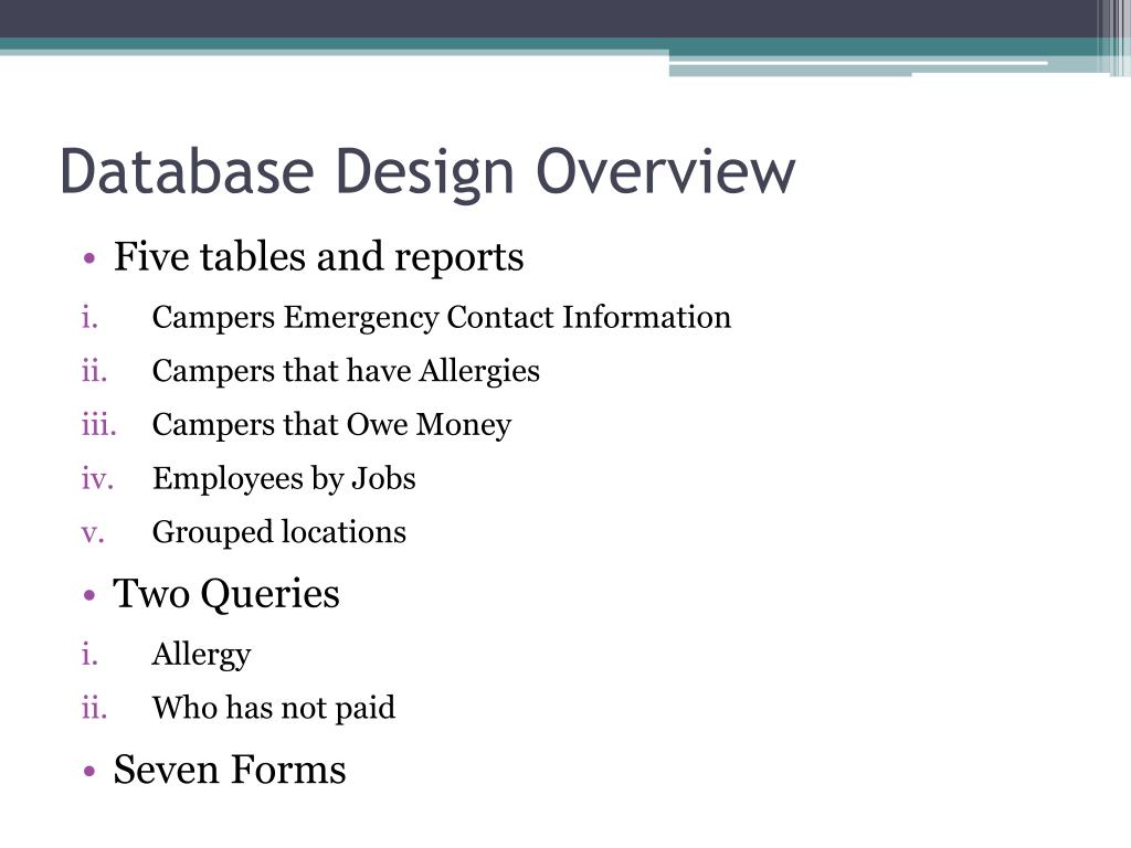 Database Design Overview • Five tables and reports • Campers Emergency Contact Information • Campers that have Allergies • Campers that Owe Money • Employees by Jobs • Grouped locations • Two Queries • Allergy • Who has not paid • Seven Forms