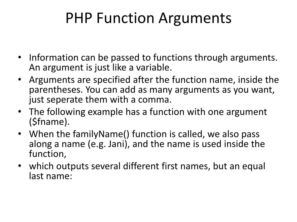 PHP Function Arguments • Information can be passed to functions through arguments. An argument is just like a variable. • Arguments are specified after the function name, inside the parentheses. You can add as many arguments as you want, just seperate them with a comma. • The following example has a function with one argument ($fname). • When the familyName() function is called, we also pass along a name (e.g. Jani), and the name is used inside the function, • which outputs several different first names, but an equal last name: