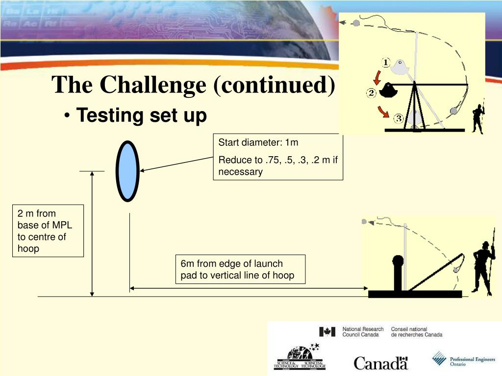 The Challenge (continued) Start diameter: 1m Reduce to .75, .5, .3, .2 m if necessary • Testing set up 2 m from base of MPL to centre of hoop 6m from edge of launch pad to vertical line of hoop