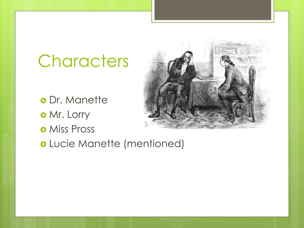 Characters • Dr. Manette • Mr. Lorry • Miss Pross • Lucie Manette (mentioned)
