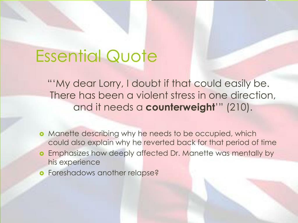 Essential Quote “‘My dear Lorry, I doubt if that could easily be. There has been a violent stress in one direction, and it needs a counterweight’” (210). • Manette describing why he needs to be occupied, which could also explain why he reverted back for that period of time • Emphasizes how deeply affected Dr. Manette was mentally by his experience • Foreshadows another relapse?
