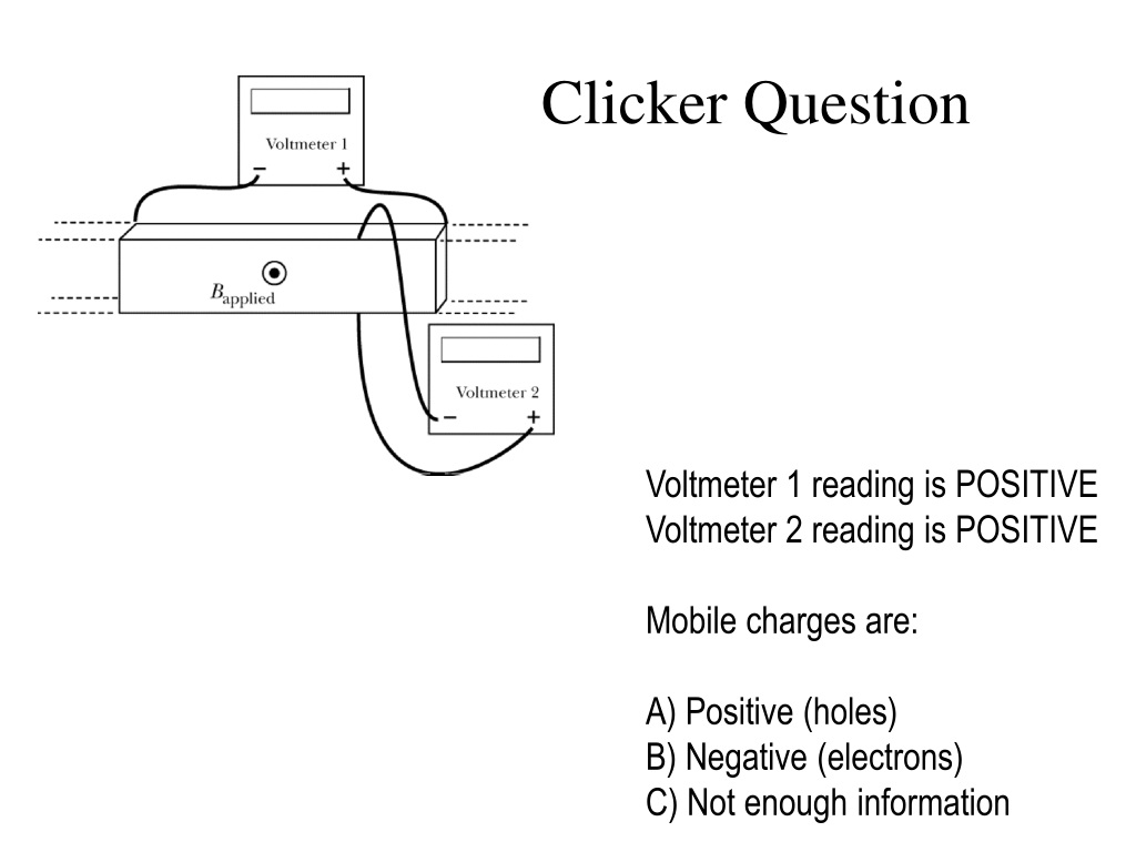 Clicker Question • Voltmeter 1 reading is POSITIVE • Voltmeter 2 reading is POSITIVE • Mobile charges are: • A) Positive (holes) • B) Negative (electrons) • C) Not enough information