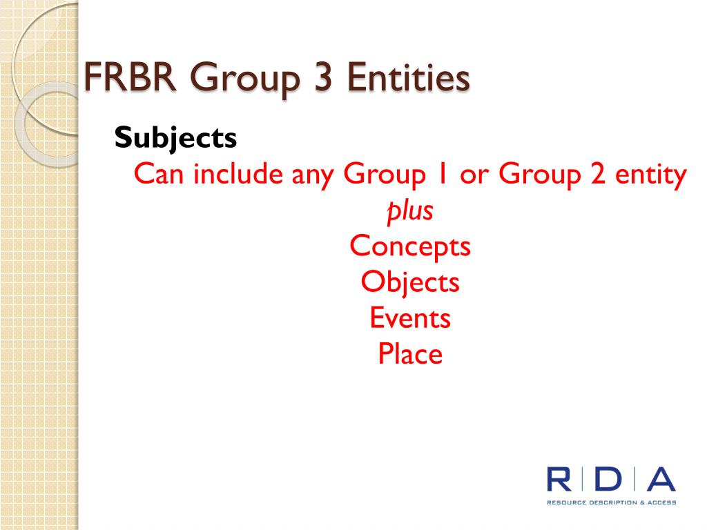 Subjects Can include any Group 1 or Group 2 entity plus Concepts Objects Events Place FRBR Group 3 Entities
