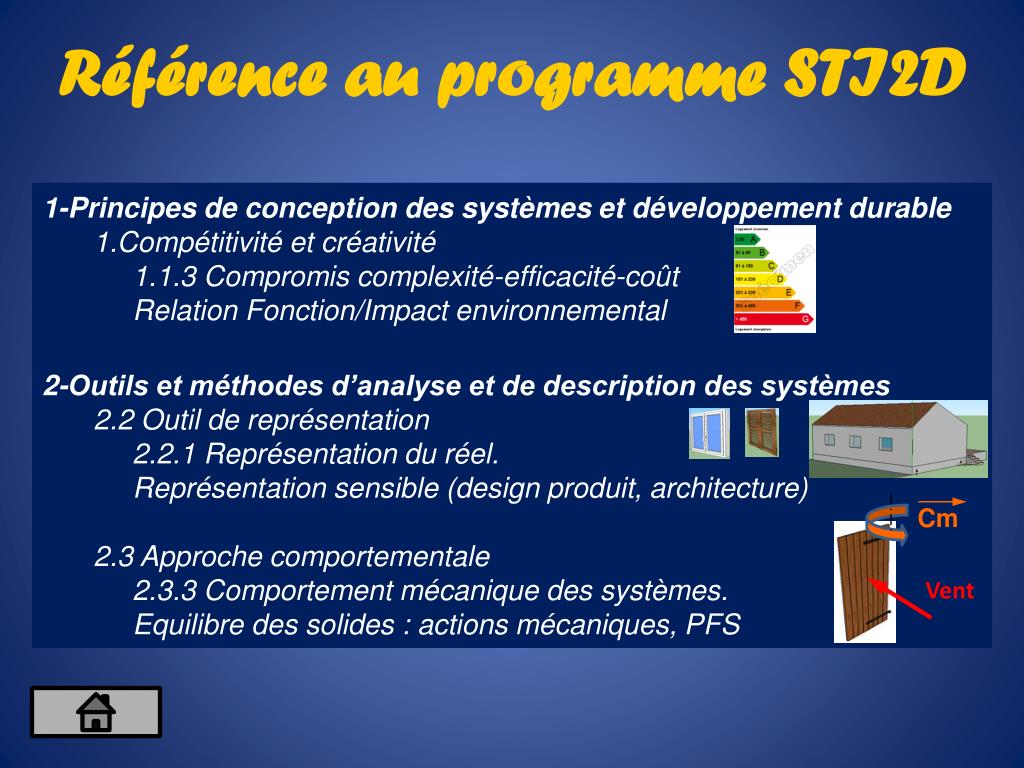 Référence au programme STI2D 1-Principes de conception des systèmes et développement durable • Compétitivité et créativité • 1.1.3 Compromis complexité-efficacité-coût • Relation Fonction/Impact environnemental 2-Outils et méthodes d’analyse et de description des systèmes • 2.2 Outil de représentation • 2.2.1 Représentation du réel. • Représentation sensible (design produit, architecture) • 2.3 Approche comportementale • 2.3.3 Comportement mécanique des systèmes. • Equilibre des solides : actions mécaniques, PFS Cm Vent