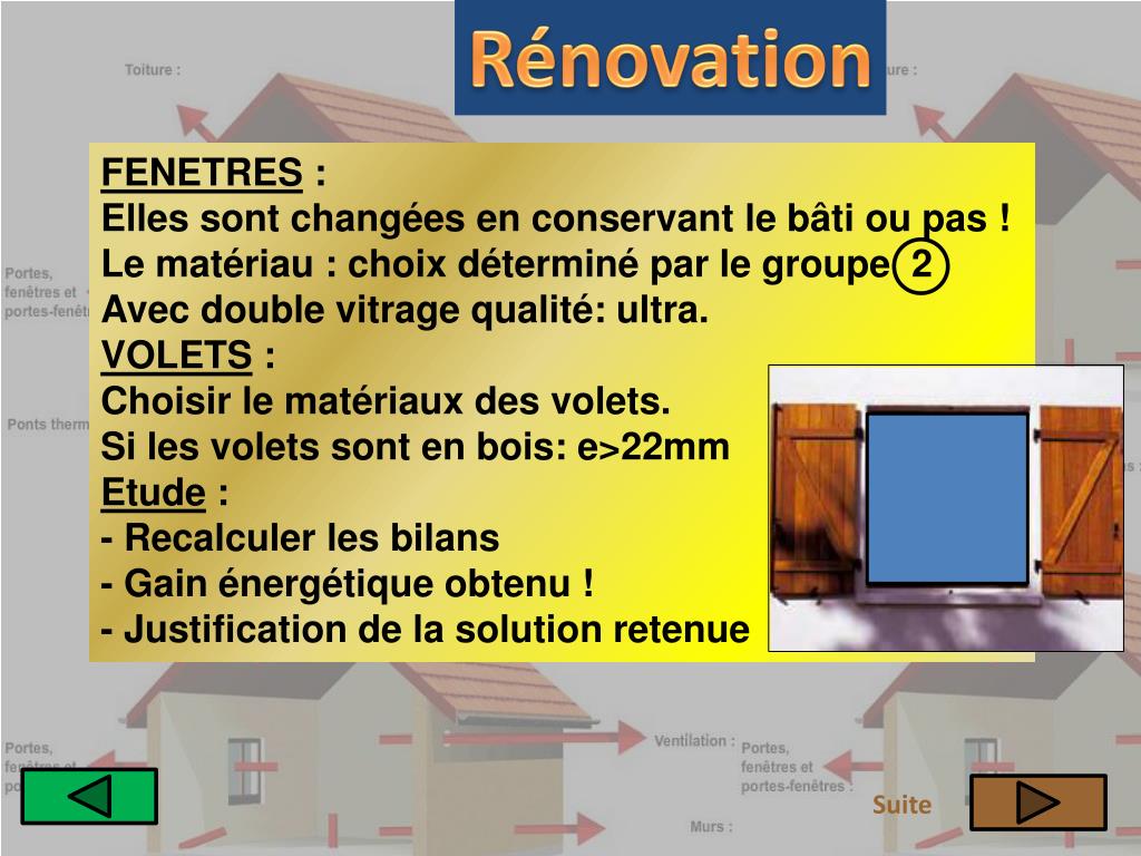 Rénovation FENETRES : Elles sont changées en conservant le bâti ou pas ! Le matériau : choix déterminé par le groupe 2 Avec double vitrage qualité: ultra. VOLETS : Choisir le matériaux des volets. Si les volets sont en bois: e>22mm Etude : - Recalculer les bilans - Gain énergétique obtenu ! - Justification de la solution retenue Suite