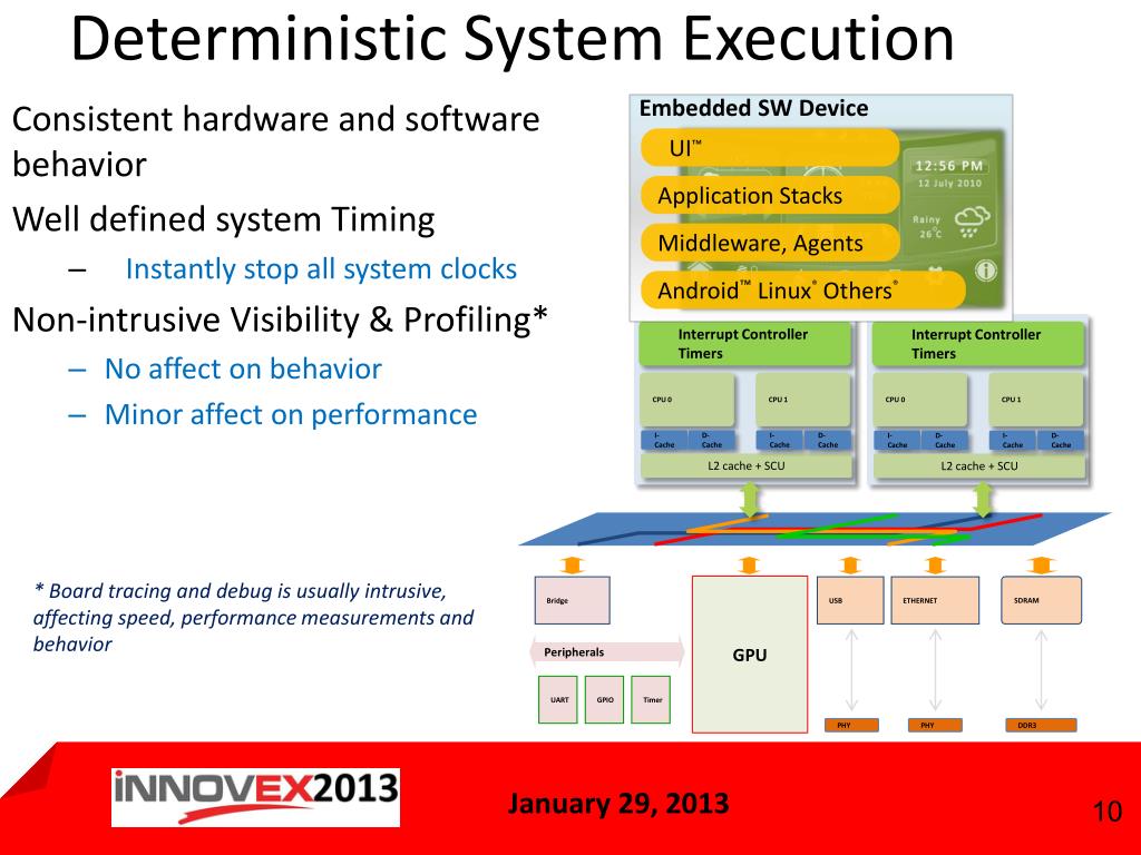 Deterministic System Execution Interrupt Controller Timers Interrupt Controller Timers CPU 0 CPU 1 CPU 0 CPU 1 Embedded SW Device I-Cache D-Cache I-Cache D-Cache I-Cache D-Cache I-Cache D-Cache L2 cache + SCU L2 cache + SCU UI™ Application Stacks Middleware, Agents Android™ Linux® Others® GPU SDRAM Bridge USB ETHERNET * Board tracing and debug is usually intrusive, affecting speed, performance measurements and behavior Peripherals UART GPIO Timer PHY PHY DDR3 Consistent hardware and software behavior Well defined system Timing • Instantly stop all system clocks Non-intrusive Visibility & Profiling* • No affect on behavior • Minor affect on performance