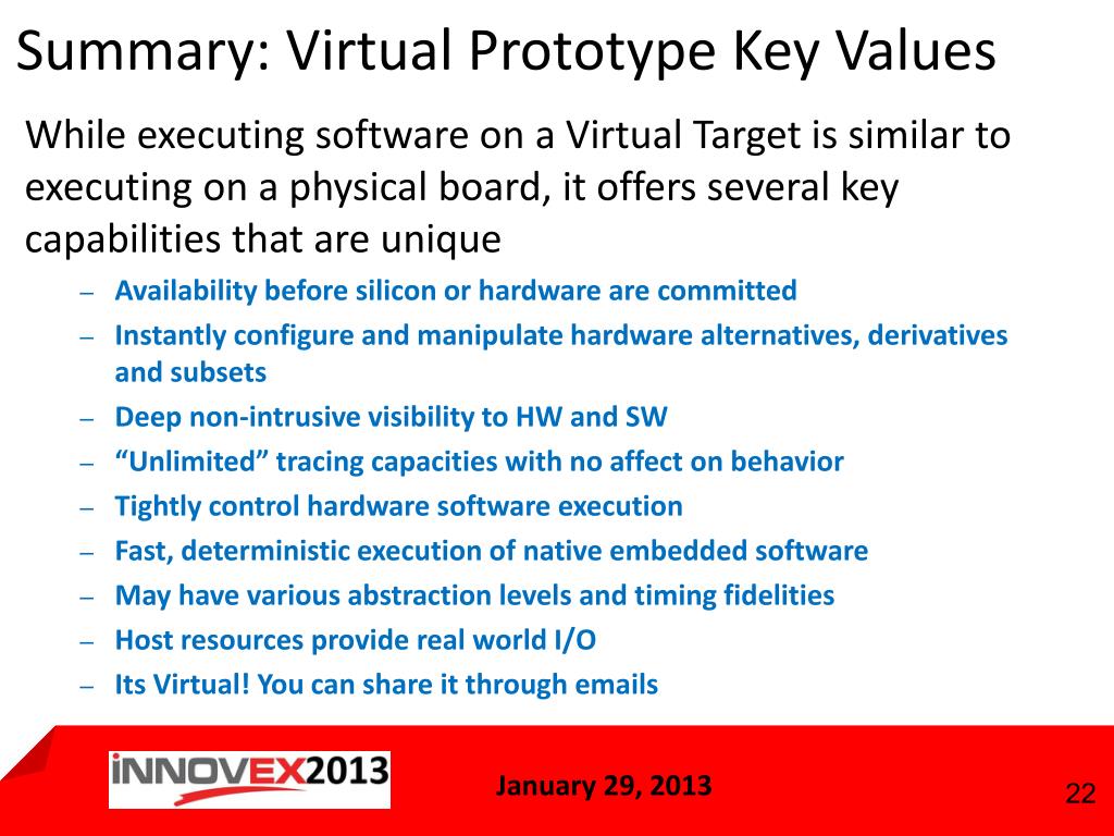 Summary: Virtual Prototype Key Values While executing software on a Virtual Target is similar to executing on a physical board, it offers several key capabilities that are unique • Availability before silicon or hardware are committed • Instantly configure and manipulate hardware alternatives, derivatives and subsets • Deep non-intrusive visibility to HW and SW • “Unlimited” tracing capacities with no affect on behavior • Tightly control hardware software execution • Fast, deterministic execution of native embedded software • May have various abstraction levels and timing fidelities • Host resources provide real world I/O • Its Virtual! You can share it through emails