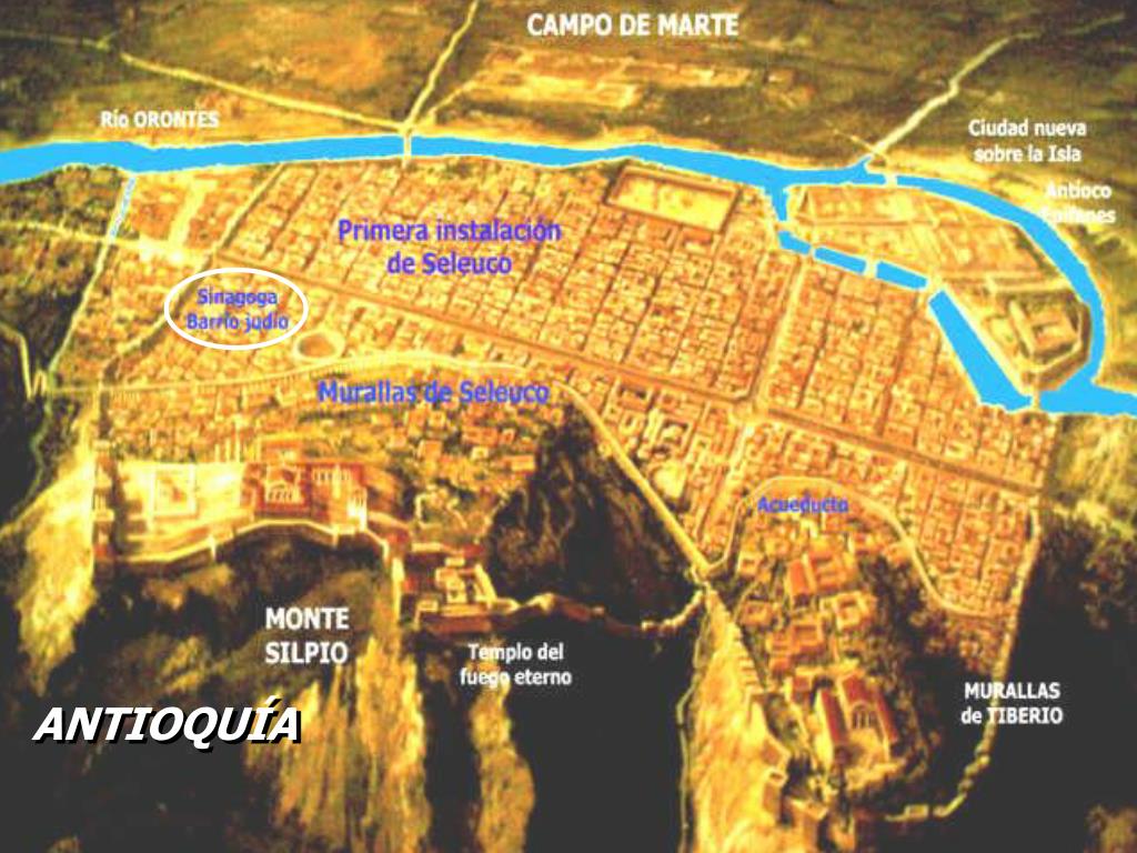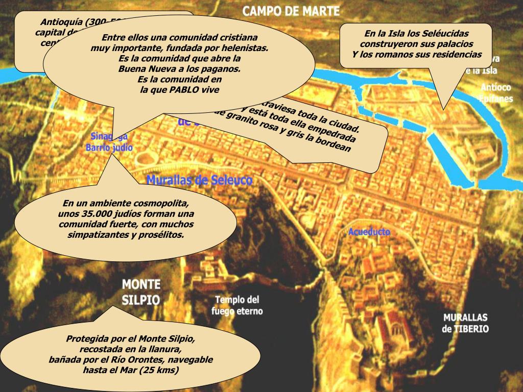 Antioquía (300-500 mil hab.), capital de la Provincia de SIRIA, centro de comunicación entre Oriente y Occidente Entre ellos una comunidad cristiana muy importante, fundada por helenistas. Es la comunidad que abre la Buena Nueva a los paganos. Es la comunidad en la que PABLO vive En la Isla los Seléucidas construyeron sus palacios Y los romanos sus residencias La “Calle e las Columnas” atraviesa toda la ciudad. Tiene 9 m. de anchura y está toda ella empedrada 3.000 columnas de granito rosa y gris la bordean En un ambiente cosmopolita, unos 35.000 judíos forman una comunidad fuerte, con muchos simpatizantes y prosélitos. Protegida por el Monte Silpio, recostada en la llanura, bañada por el Río Orontes, navegable hasta el Mar (25 kms)