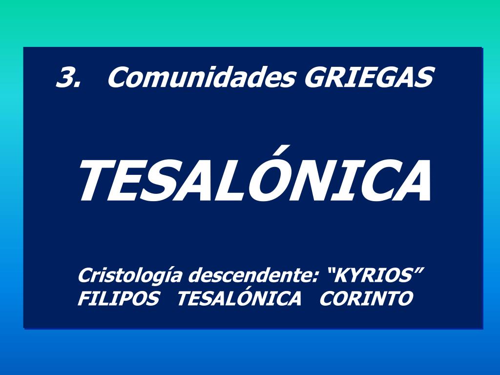 3. Comunidades GRIEGAS • Espontáneas, libres y bulliciosas • Desunidas y con rivalidades • Como un rebaño de cabras • Religiosidad de la sensibilidad • Mínimo sentido moral • Conflictivas y tumultuosas • El “evangelio de Pablo” • Cristología descendente: “KYRIOS” • FILIPOS TESALÓNICA CORINTO TESALÓNICA