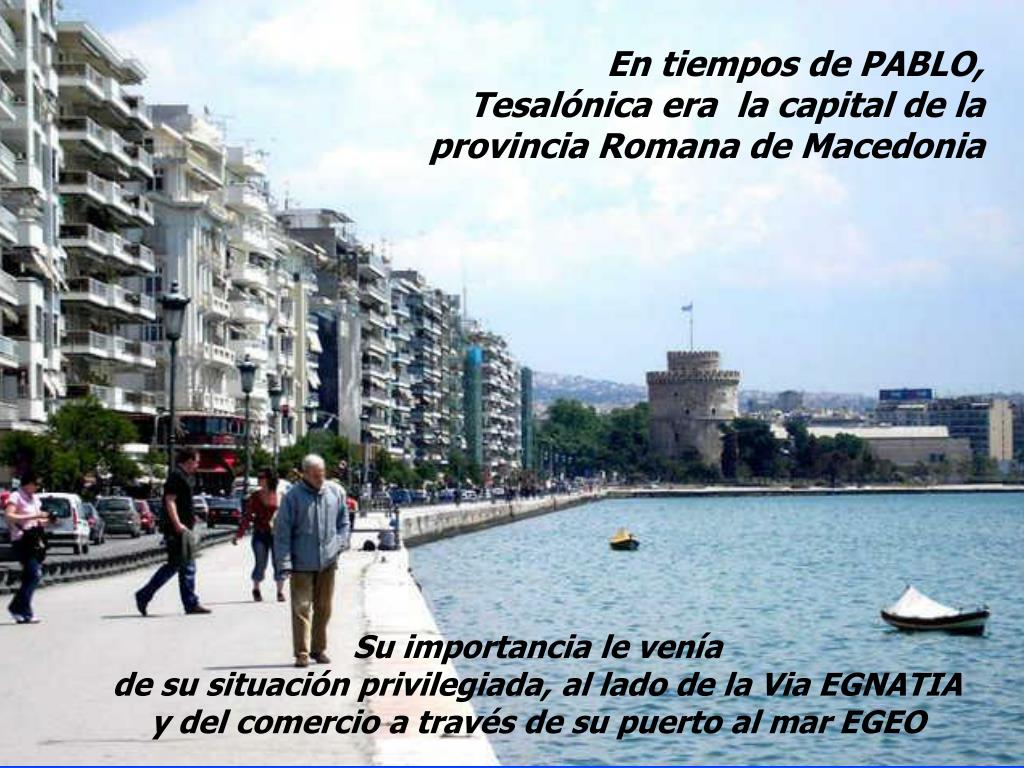En tiempos de PABLO, Tesalónica era la capital de la provincia Romana de Macedonia Su importancia le venía de su situación privilegiada, al lado de la Via EGNATIA y del comercio a través de su puerto al mar EGEO