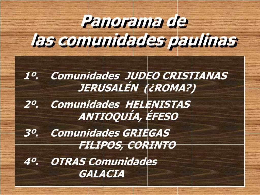 Panorama de las comunidades paulinas • 1º. Comunidades JUDEO CRISTIANAS • JERUSALÉN (¿ROMA?) • 2º. Comunidades HELENISTAS • ANTIOQUÍA, ÉFESO • 3º. Comunidades GRIEGAS • FILIPOS, CORINTO • 4º. OTRAS Comunidades • GALACIA