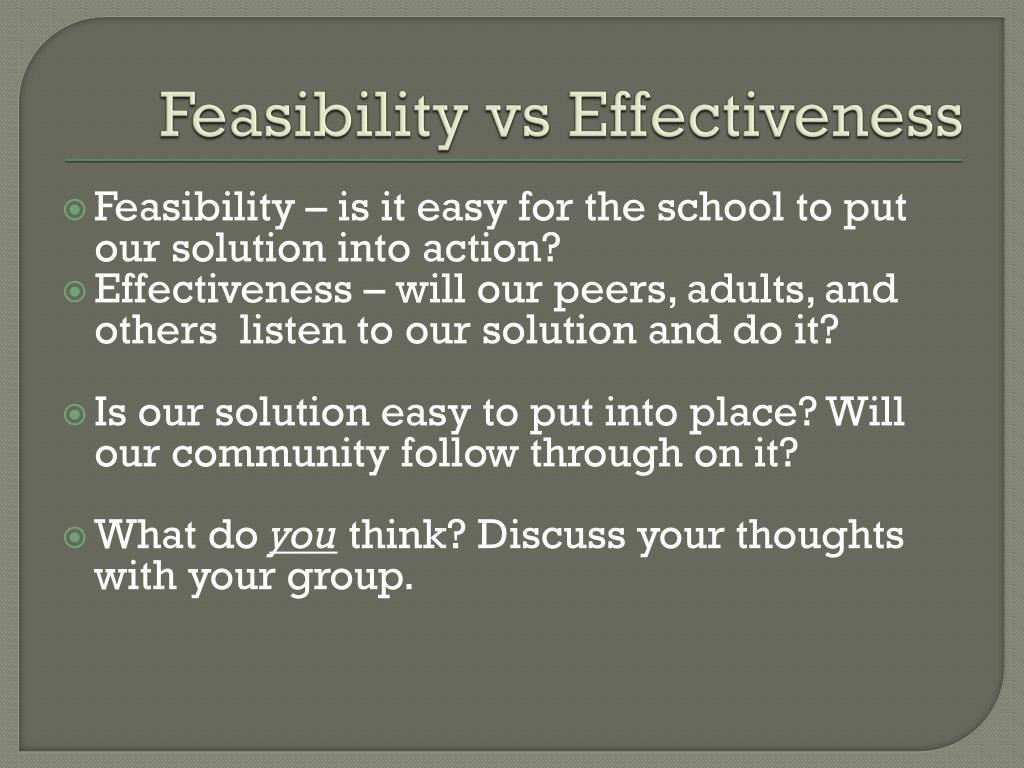 Feasibility vs Effectiveness Feasibility – is it easy for the school to put our solution into action? Effectiveness – will our peers, adults, and others listen to our solution and do it? Is our solution easy to put into place? Will our community follow through on it? What do you think? Discuss your thoughts with your group.